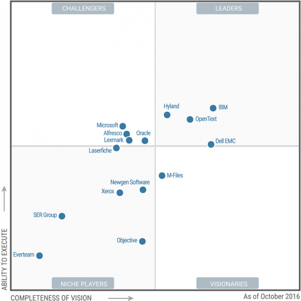 Le Magic Quadrant for Enterprise Content Management (ECM) de Gartner 2016 place Alfresco pour la première fois dans la catégorie des challengeurs. Le rapport établit une liste non exhaustive des forces de la solution : une plateforme open source personnalisable… Continue Reading →