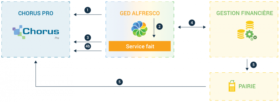 3. Une fois le service fait certifié dans la GED, Alfresco envoie une mise à jour de l’état de la facture : le statut de la facture passe à Service fait dans Chorus Pro.
