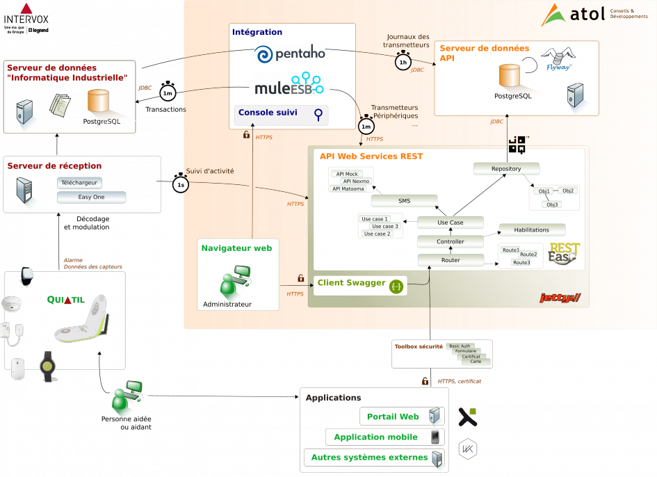 Intervox a confié à Atol la mise en place d’un middleware dont le but est de fluidifier la communication entre la solution technique de gestion des transmetteurs et les applications fonctionnelles ouvertes. Ainsi, le middleware se charge de l’organisation et du retraitement de la masse des flux de données (ETL, ESB) et de présenter l’information avec une vision de plus haut niveau via une API HTTP REST sécurisée.