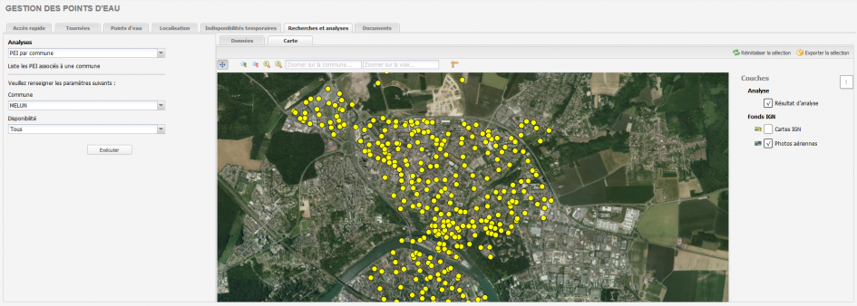 - Une fois référencés, les modèles de requêtes sont accessibles aux utilisateurs REMOcRA à travers l’interface « Recherche et analyse » du module de gestion des points d’eau (si la fonctionnalité a été autorisée pour leur profil) . Seules les analyses autorisées pour le profil sont accessibles