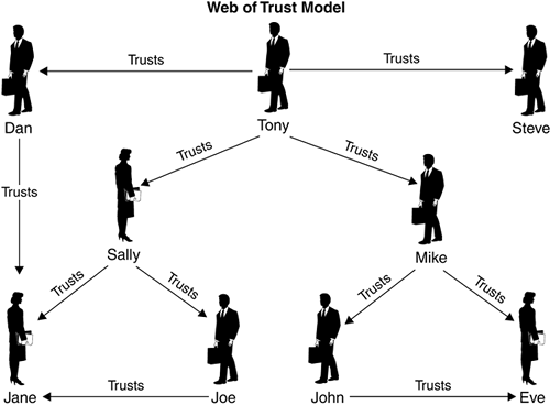 Plus tard, PGP (et son implémentation GPG) introduit la notion de “toile de confiance” (“web of trust”) : les personnes peuvent signer (cryptographiquement) leurs clés les uns les autres (de préférence lors d’une rencontre physique) et peuvent ainsi donner leur confiance à des inconnus si elles font confiance aux intermédiaires dans la toile (si Alice a confiance en Bernard, et Bernard a confiance en Carole, alors Alice peut vraisemblablement faire confiance à Carole). Opérationnellement moins lourd que les échanges en main propre, mais bien trop difficile à utiliser, PGP est réservé aux experts (et même les experts s’y perdent, Snowden ne fait pas exception).